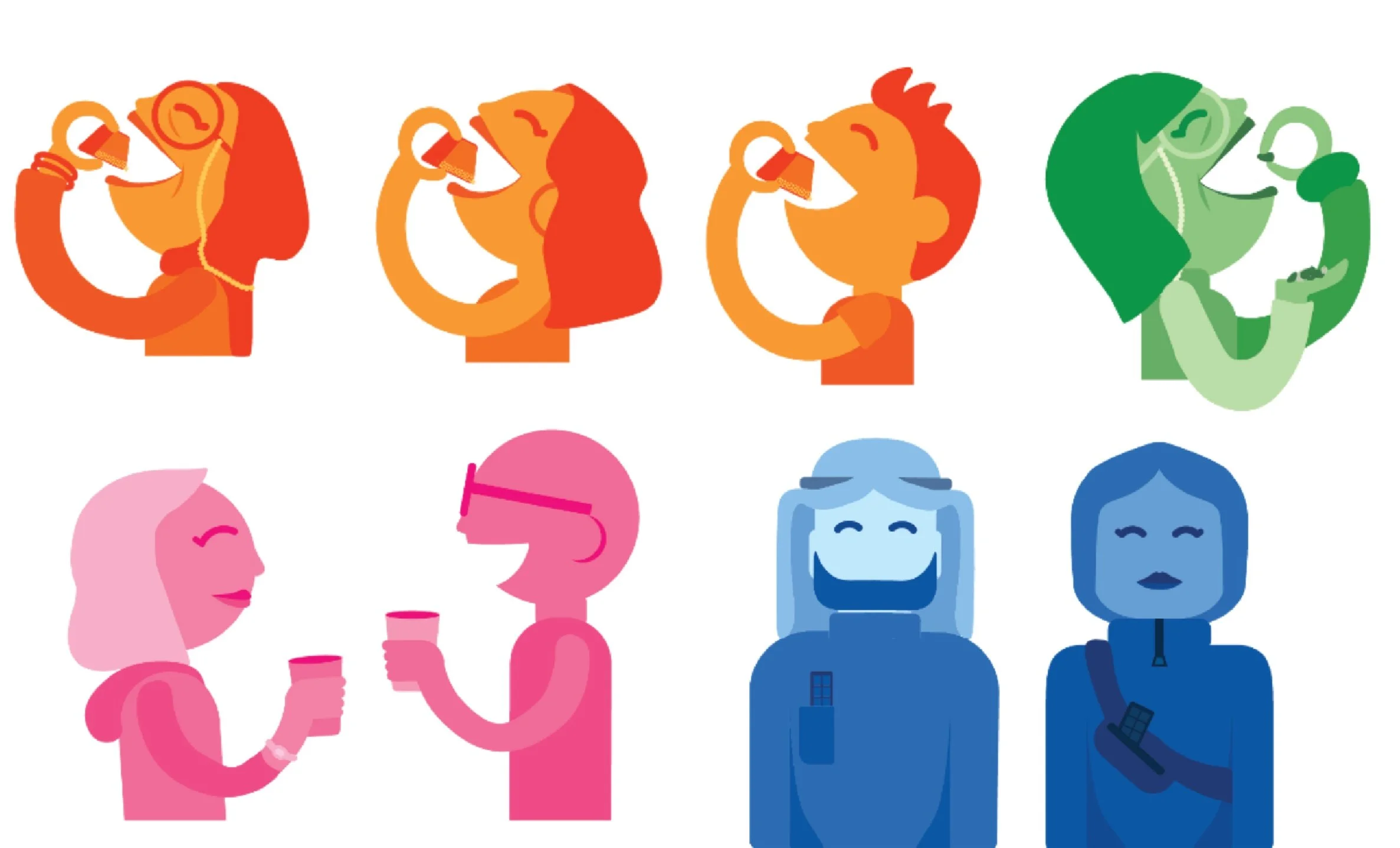 The characters designs were focused on representing people we see in our society, from elders to children. The brands friendliness is represented through the roundness of the character designs.